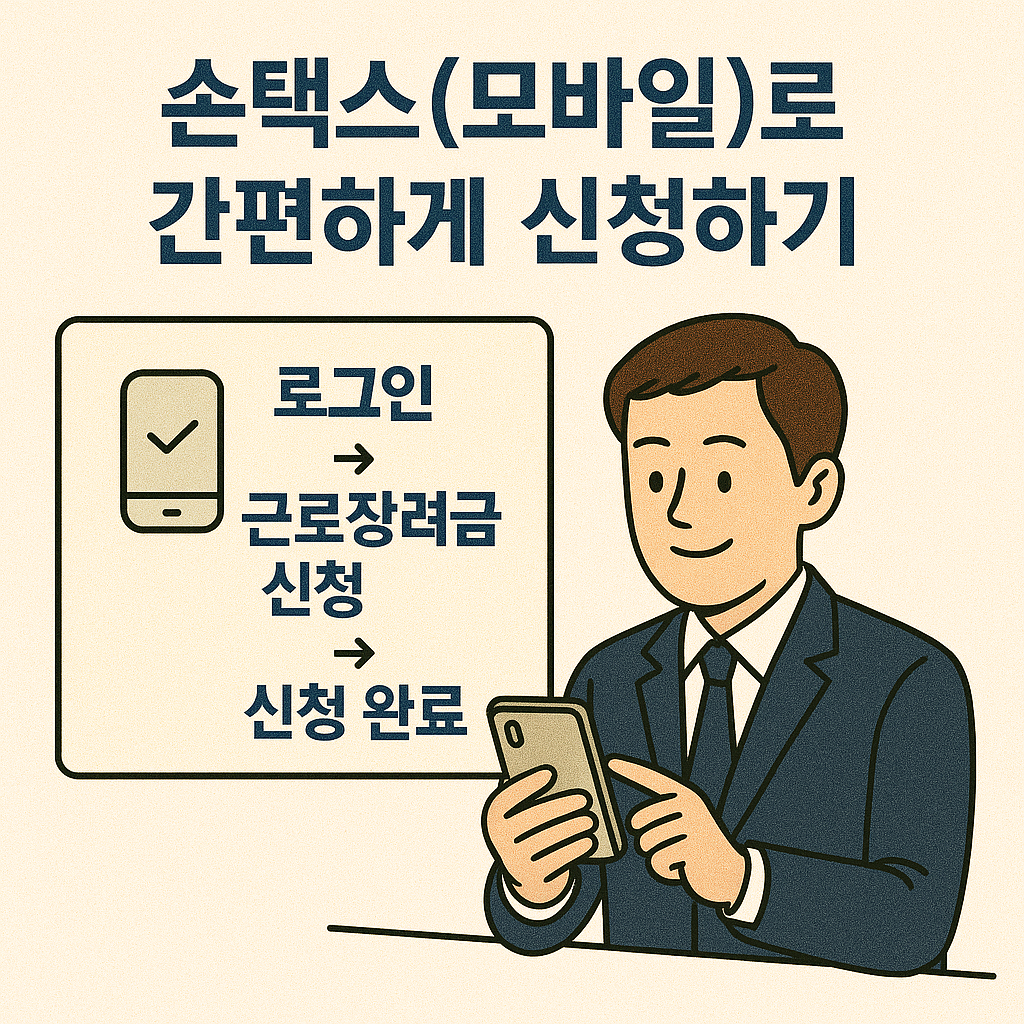 모바일로 가능한 대표적인 근로장려금 신청 방법입니다. ‘손택스’ 앱 다운로드 후 로그인하면 직관적인 UI로 쉽게 신청할 수 있습니다.